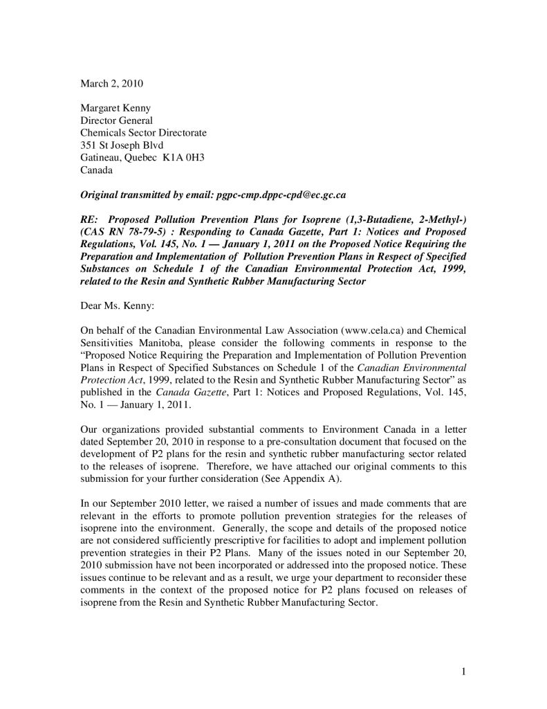 Letter re: proposed pollution prevention plans for Isoprene (1,3-Butadiene, 2-Methyl-)(CAS RN 78-79-5)