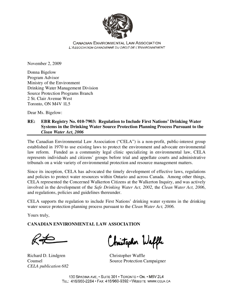 Letter re: regulation to include First Nations’ drinking water systems in the drinking water source protection planning process pursuant to the Clean Water Act, 2006