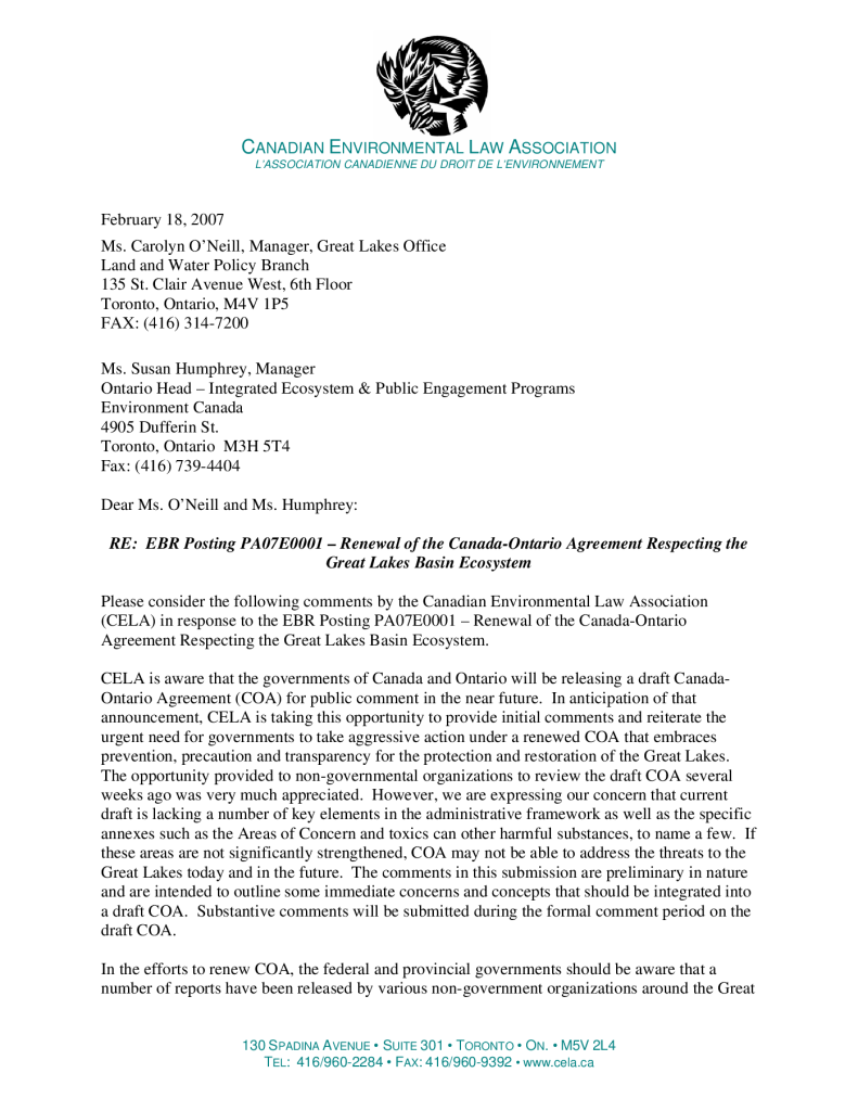 Letter re: Renewal of the Canada-Ontario Agreement Respecting the Great Lakes Basin ecosystem