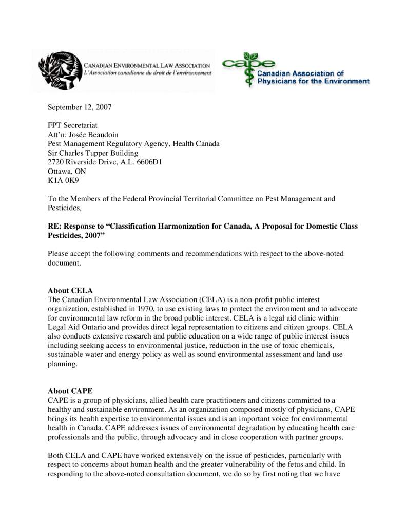 Letter re: Response to “Classification harmonization for Canada, a proposal for domestic class pesticides, 2007”