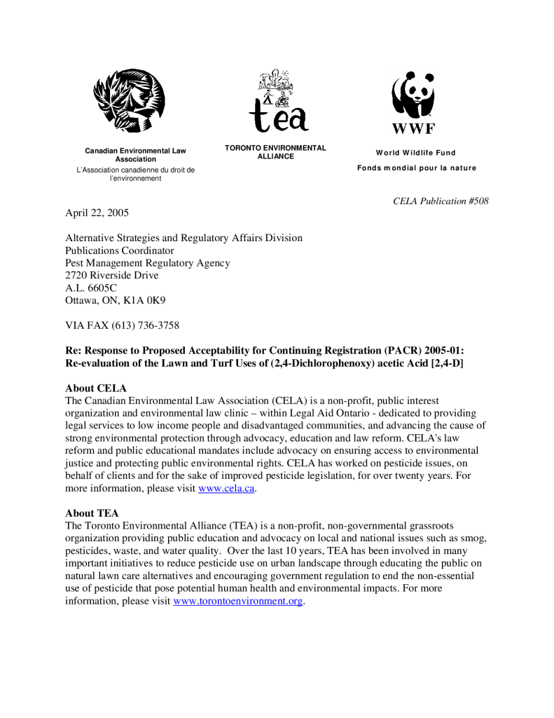 Letter re: Response to proposed acceptability for continuing registration (PACR) 2005-01: Re-evaluation of the lawn and turf uses of (2,4-Dichlorophenoxy) acetic Acid (2,4-D)