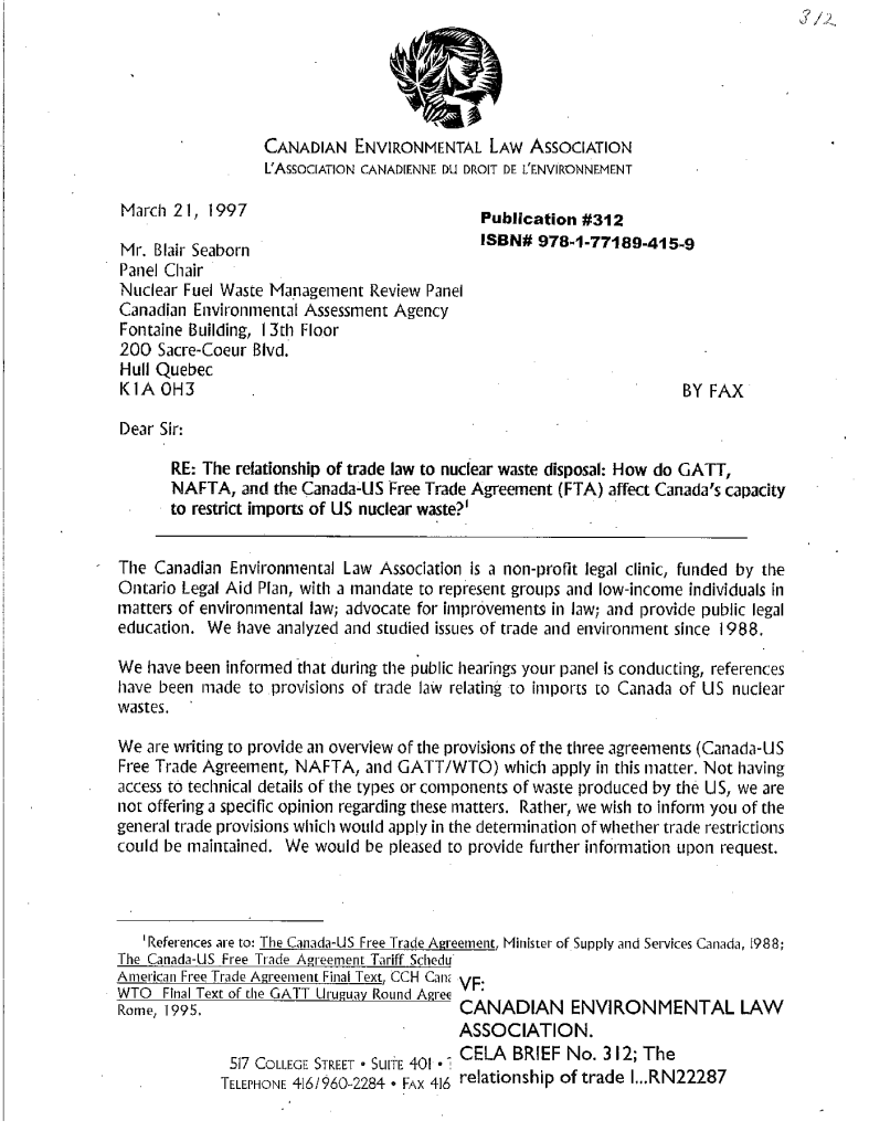 Letter re: The relationship of trade law to nuclear waste disposal: How do GATT, NAFTA, and the Canada-U.S. Free Trade Agreement (FTA) affect Canada’s capacity to restrict imports of U.S. nuclear waste?