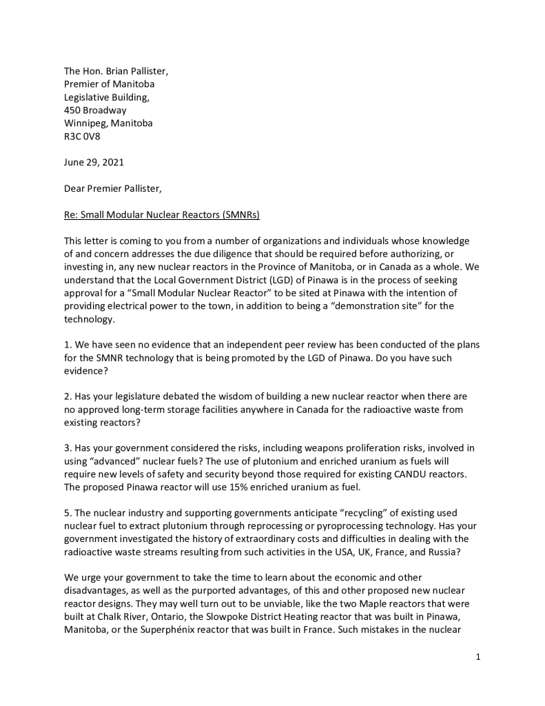 Letter regarding Small Modular Nuclear Reactors in Pinawa, Manitoba