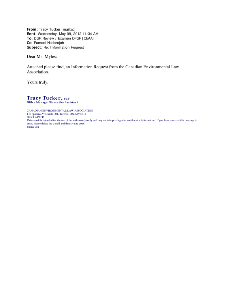 Letter to CEAA re Information Request Concerning Deep Geologic Repository Project for Low and Intermediate Radioactive Waste