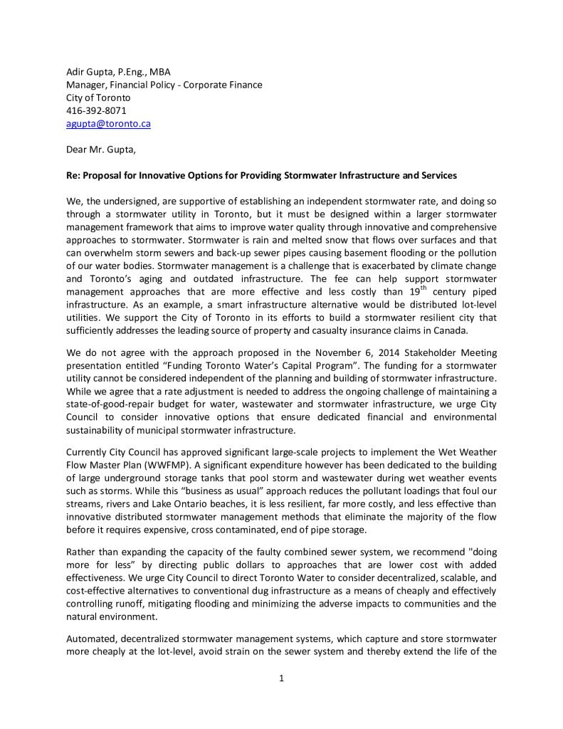 Letter to City of Toronto Manager Adir Gupta Regarding Stormwater Infrastructure Proposal