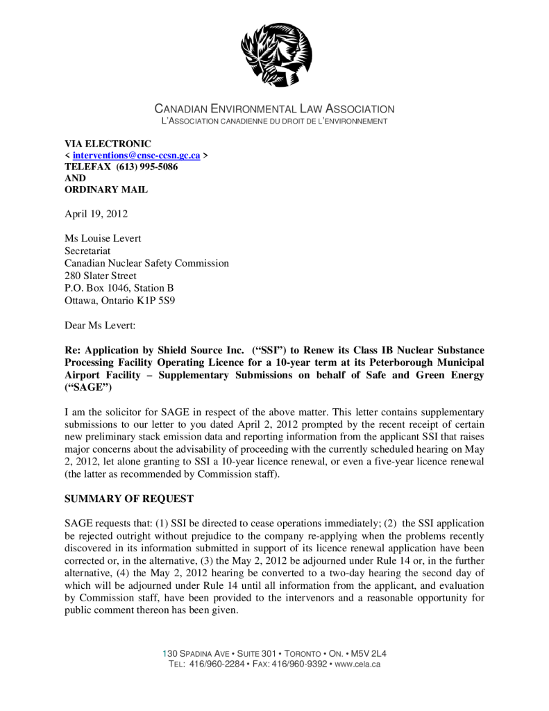 Letter to CNSC Re Application by Shield Source Inc. to Renew Class 1B Nuclear Substance Processing Facility Operating Licence.