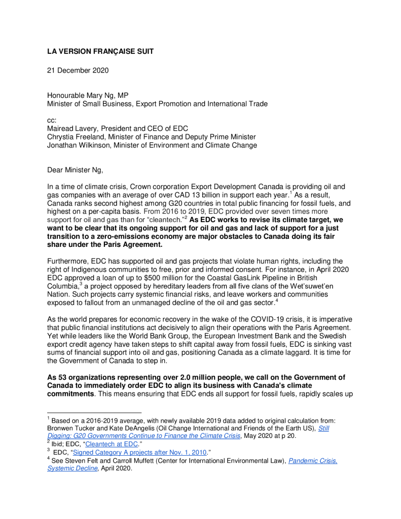 Letter to Export Development Canada regarding public financing of fossil fuels and respecting Indigenous rights