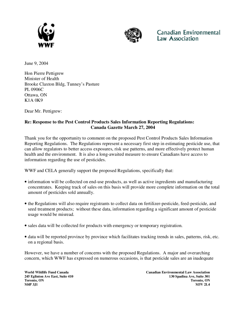 Letter to Hon Pierre Pettigrew, Minister of Health re: response to the Pest Control Products Sales Information Reporting Regulations: Canada Gazette March 27, 2004