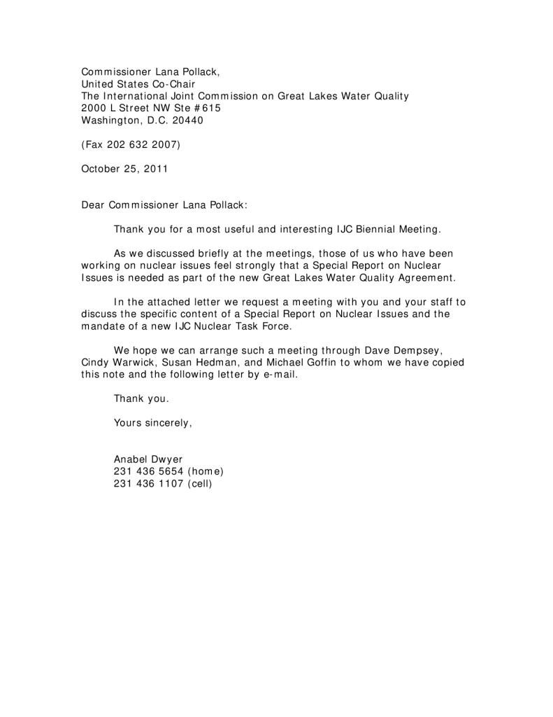 Letter to IJC Commissioners regarding a special report on nuclear issues