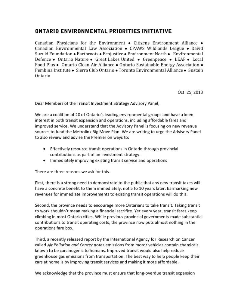Letter to Members of the Transit Investment Strategy Advisory Panel