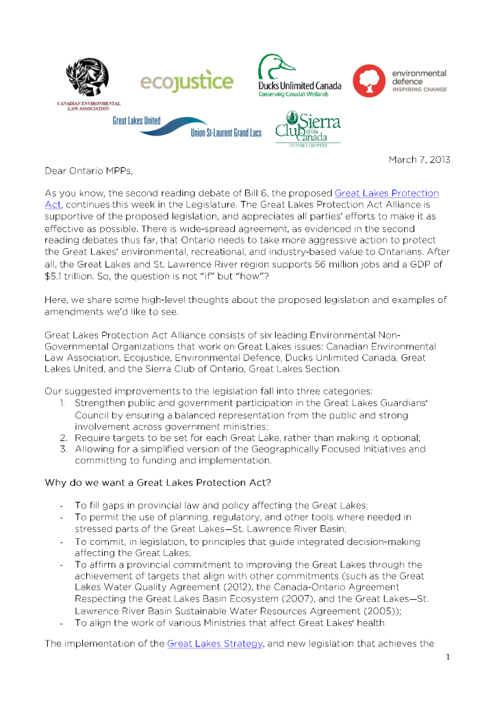 Letter to Ontario MPPs regarding the Great Lakes Protection Act Joint letter from members of the Great Lakes Protection Act Alliance