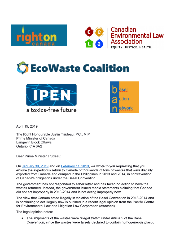 Letter to PM Trudeau re contravention of Canada’s obligations under the Basel Convention Letter from five organizations with associated legal opinion prepared by Pacific Centre for Environmental Law and Litigation