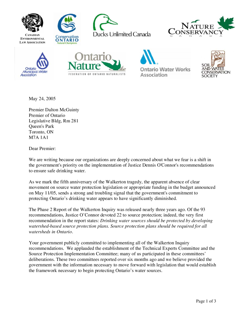 Letter to Premier McGuinty re: Source Protection Joint Letter – May 24, 2005