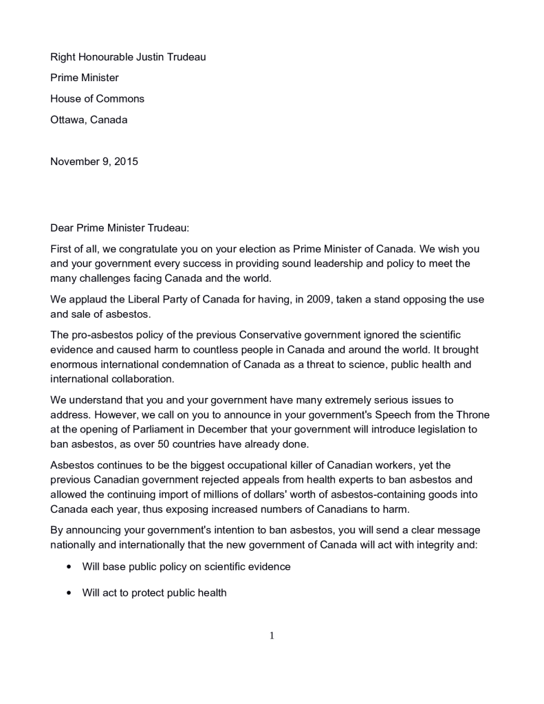 Letter to Prime Minister Justin Trudeau seeking Canadian ban on asbestos