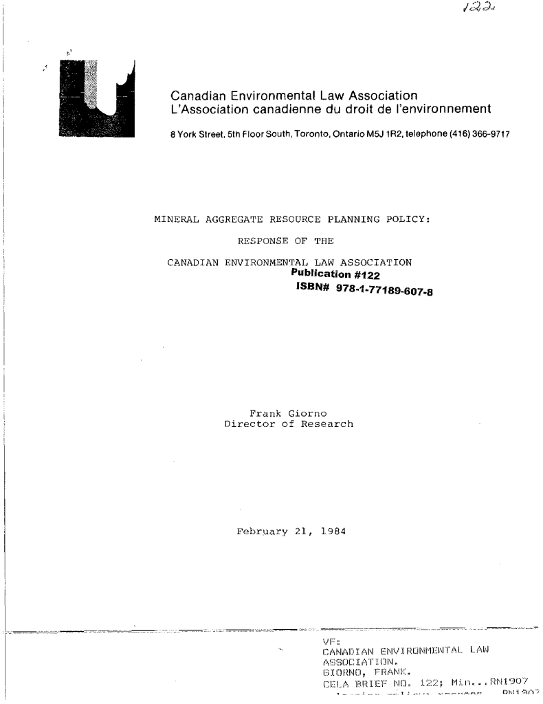 Mineral aggregate resource planning policy: response of the Canadian Environmental Law Association