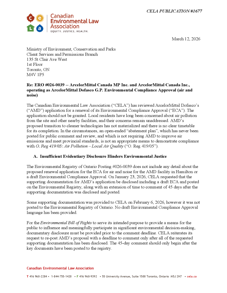 Ministry of Environment, Conservation and Parks Should Not Grant ArcelorMittal Dofasco’s Application to Renew its ECA Without Air Pollution Improvements