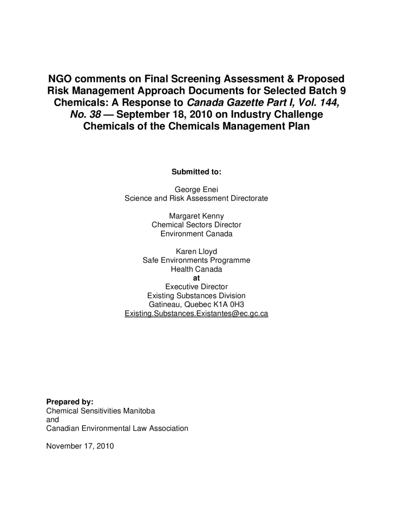 NGO comments on final screening assessment and proposed risk management approach documents for selected Batch 9 chemicals: a response to Canada Gazette Part I, Vol. 144, No. 38, September 18, 2010 on Industry Challenge Chemicals of the Chemicals Management Plan