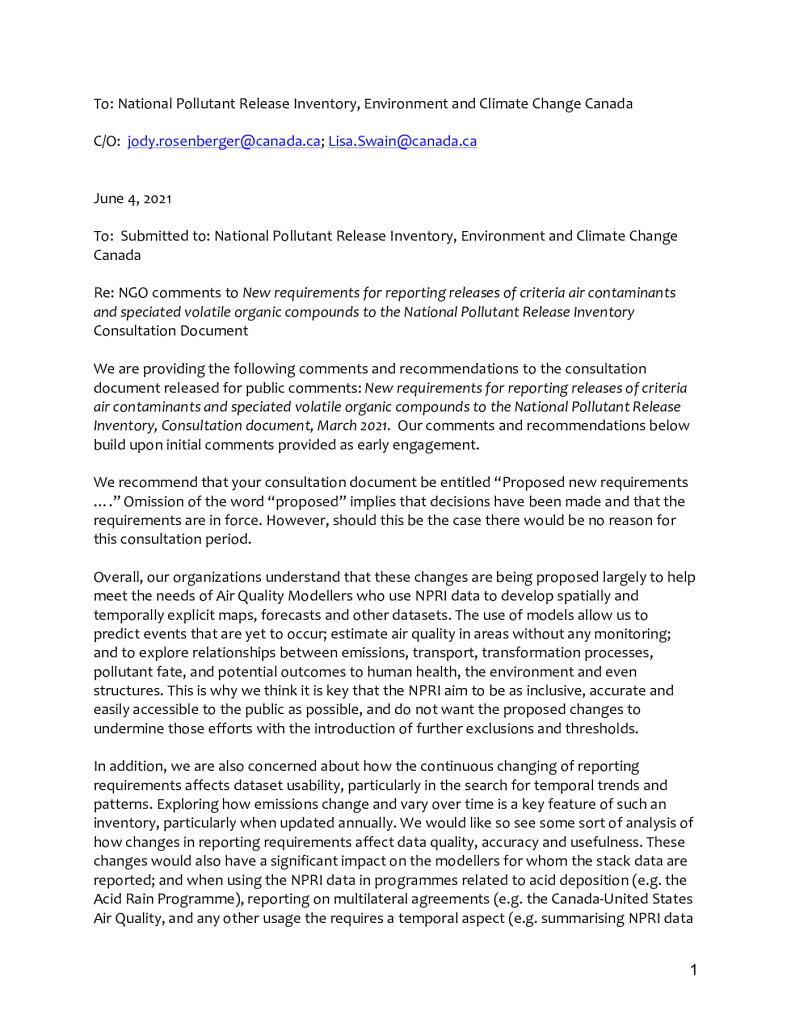 NGO comments to Changes to the National Pollutant Release Inventory substance list for 2022