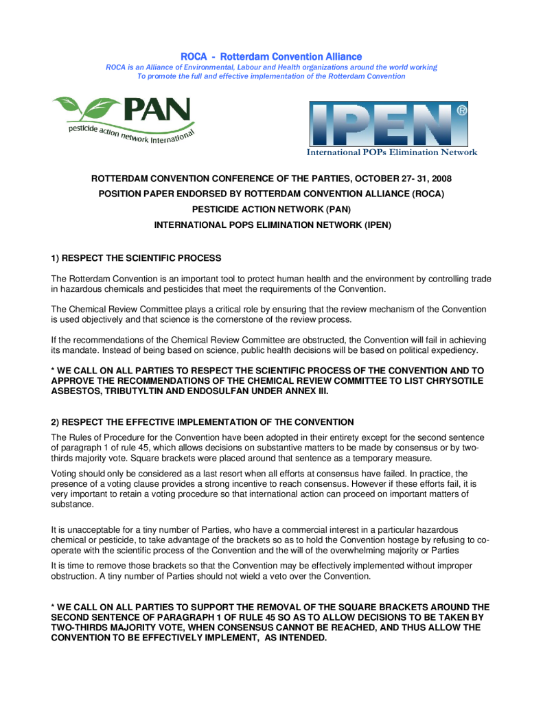 NGO Position Paper to the Rotterdam Convention Conference of the Parties, October 27-31, 2008