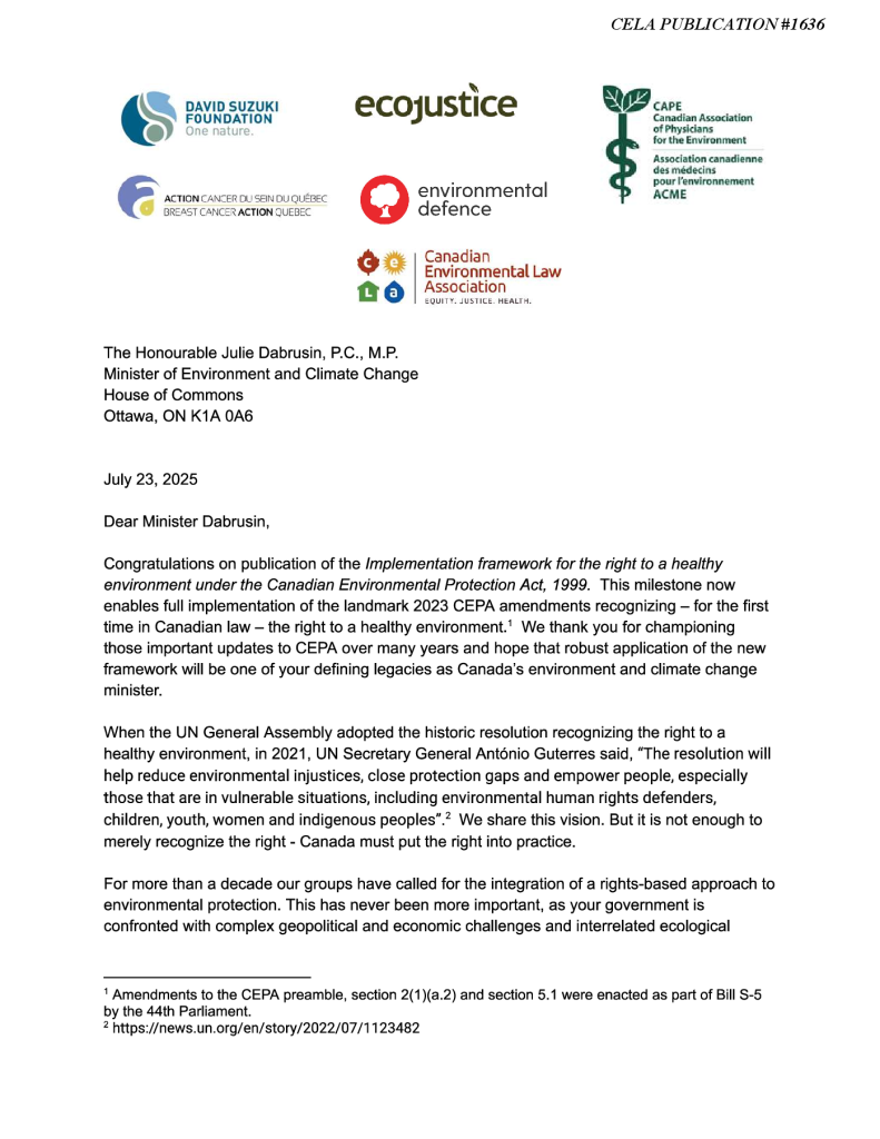NGO’s Submission to the Minister of Environment and Climate Change in support of the Right to a Healthy Environment