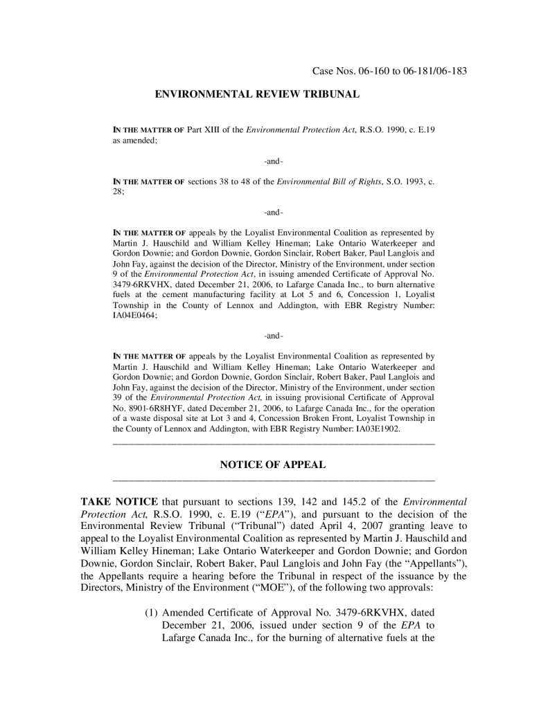 Notice of Appeal (re Lafarge Canada proposal to burn tires and other waste in cement kiln)