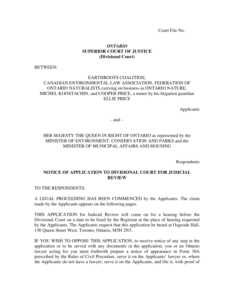 Notice of Application to Divisional Court for Judicial Review – Bill 197 (COVID-19 Economic Recovery Act, 2020)