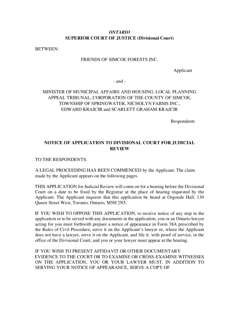 Notice of Application to Divisional Court for Judicial Review (Friends of Simcoe Forest)