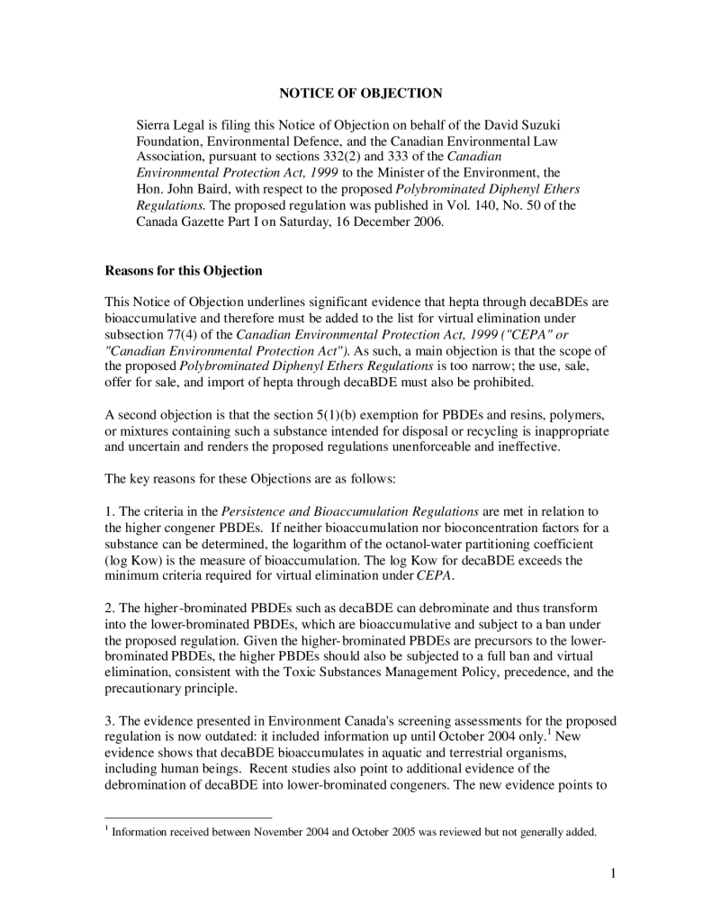 Notice of Objection Re: Proposed Polybrominated Diphenyl Ethers Regulation