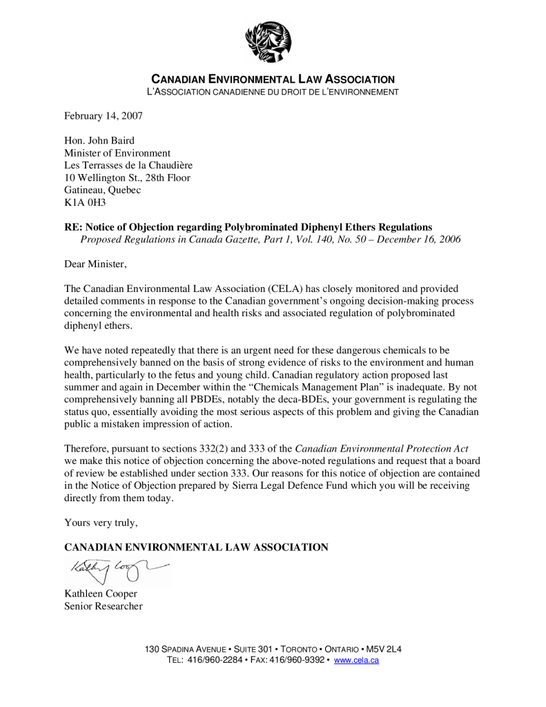 Notice of Objection regarding Polybrominated Diphenyl Ethers Regulations-cover-letter