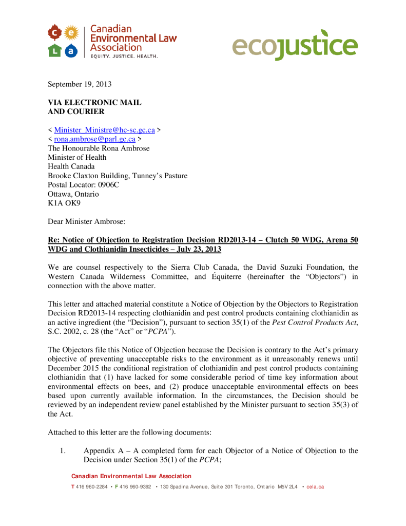 Notice of Objection to Registration Decision RD2013-14 – Clutch 50 WDG, Arena 50 WDG and Clothianidin Insecticides – July 23, 2013