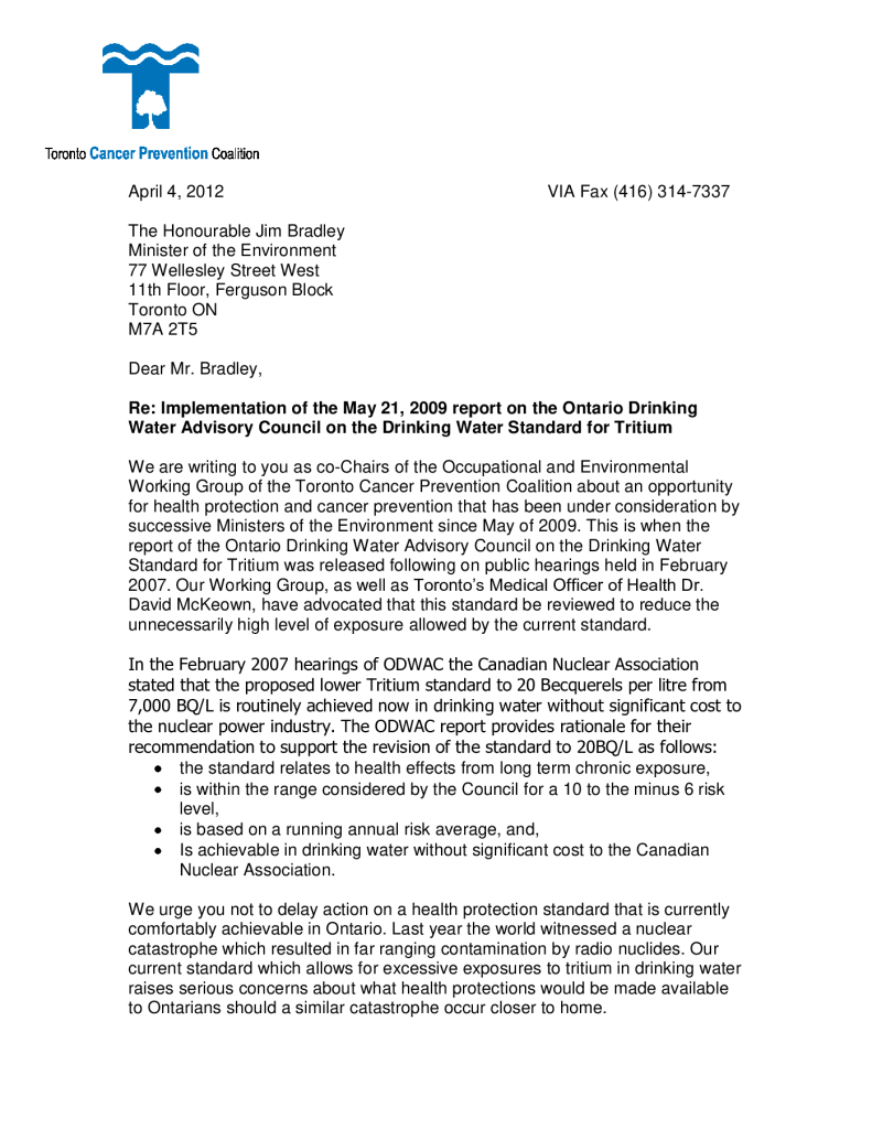 Ontario Drinking Water Advisory Council on the Drinking Water Standard for Tritium