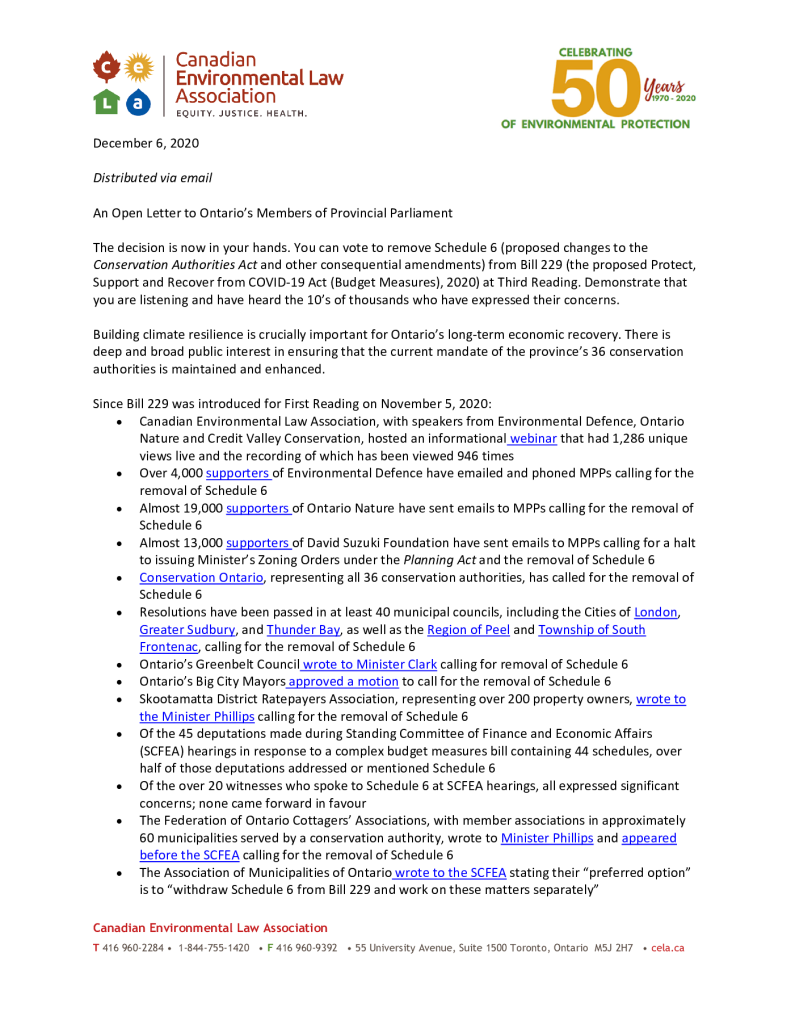 Open Letter to Ontario MPP’s on Bill 229 (Protect, Support and Recover from COVID-19 Act (Budget Measures), 2020)