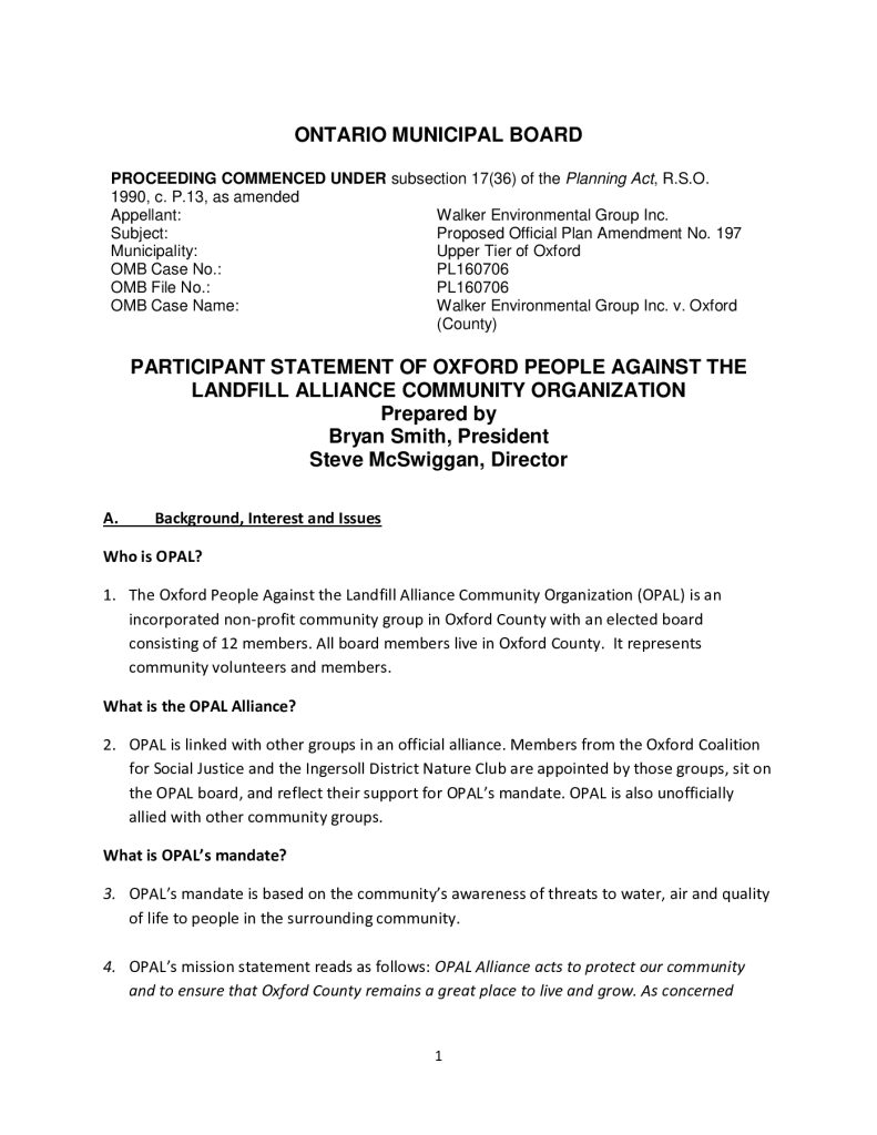 Participant Statement (before Ontario Municipal Board) of Oxford People Against the Landfill Alliance Community Organization