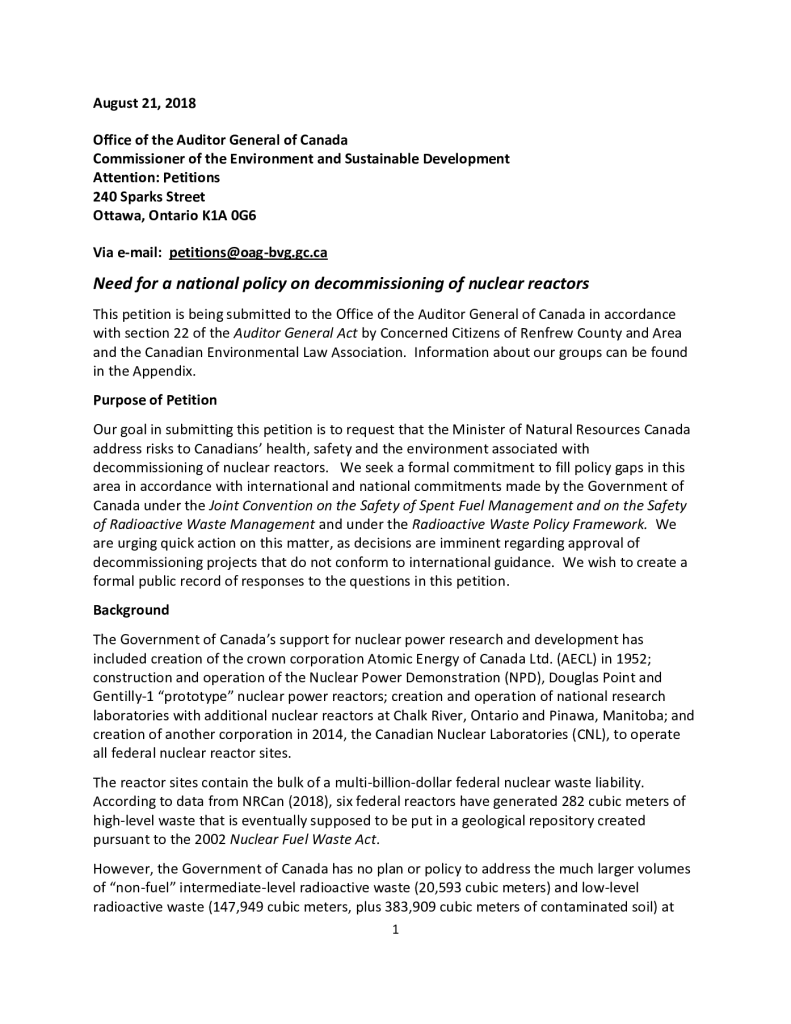 Petition to Commissioner of Environment and Sustainable Development re Nuclear Waste