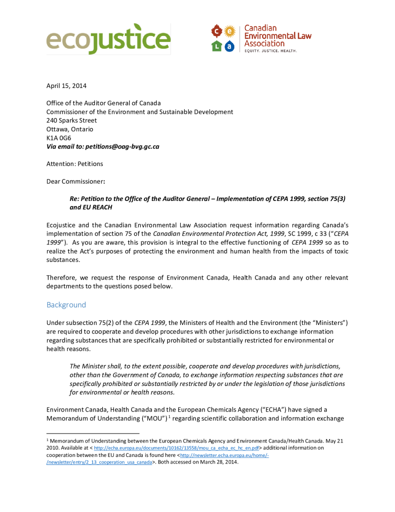 Petition to the Office of the Auditor General – Implementation of CEPA 1999, Sect. 75(3) and EU REACH