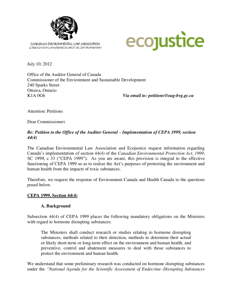 Petition to the Office of the Auditor General – Implementation of CEPA 1999, section 44(4)