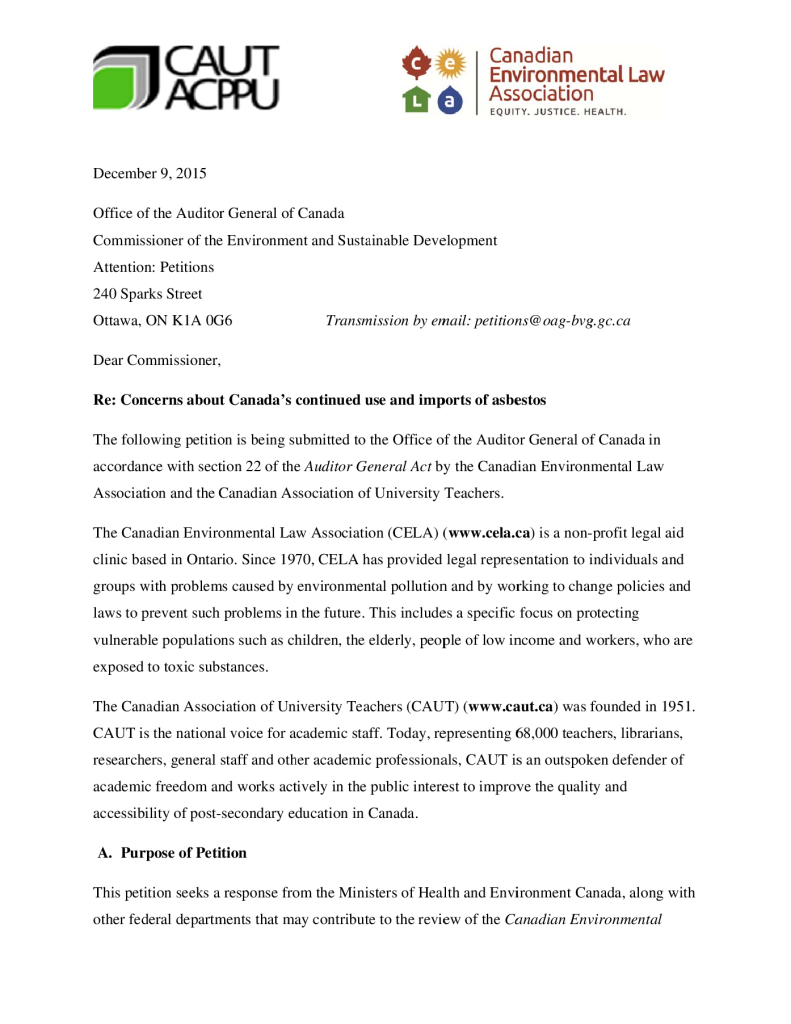 Petition to the Office of the Auditor General regarding Canada’s continued use and imports of asbestos