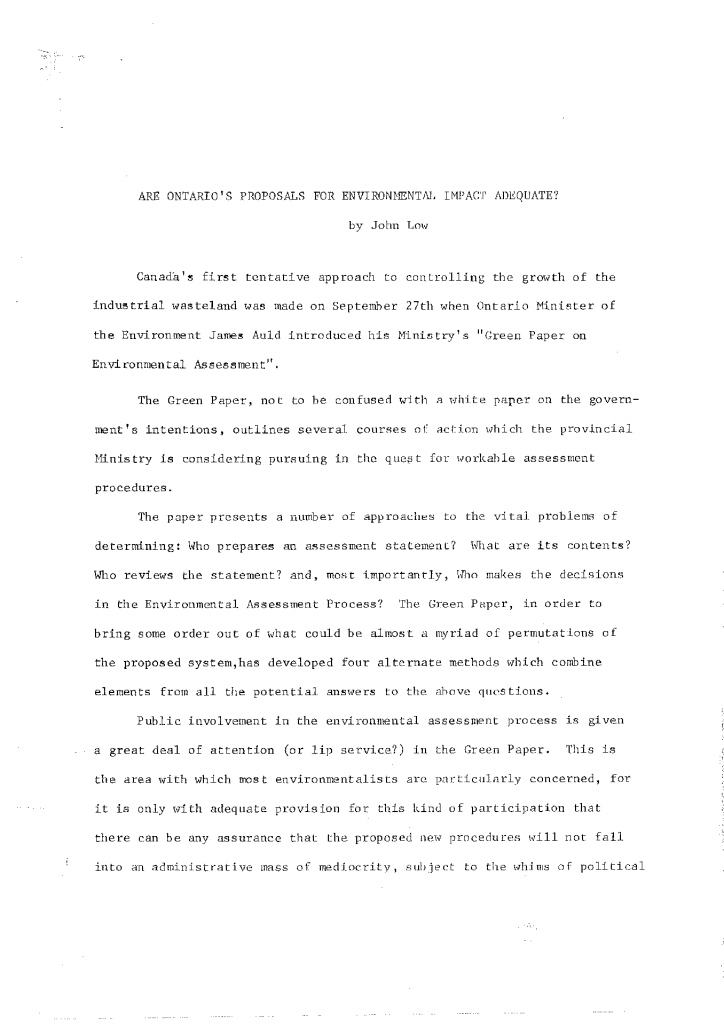 Concerns correspondence for John Low’s “Are Ontario’s proposal for environmental impact adequate?”