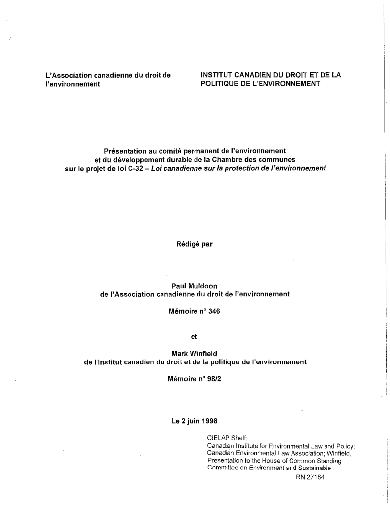 Presentation au comite permanent de l’environnement et du developpement durable de la chambre des communes sure le projet de loi C-32 – Loi canadienne sur la protection de l’environnement