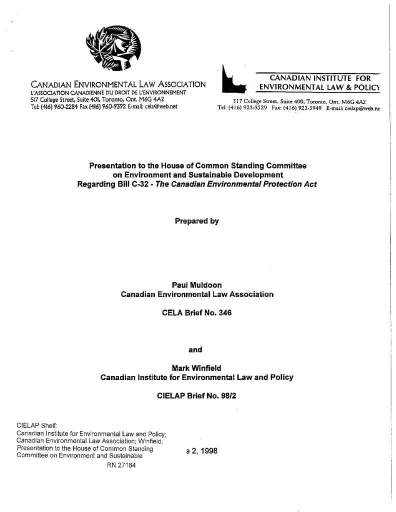 Presentation to the house of common standing committee on environmental and sustainable development regarding Bill C-32 – The Canadian Environmental Protection Act