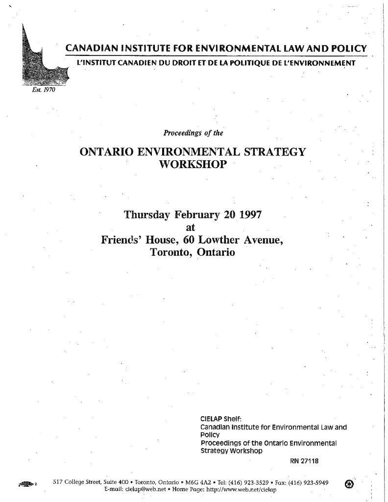 Proceedings of the Ontario environmental strategy workshop