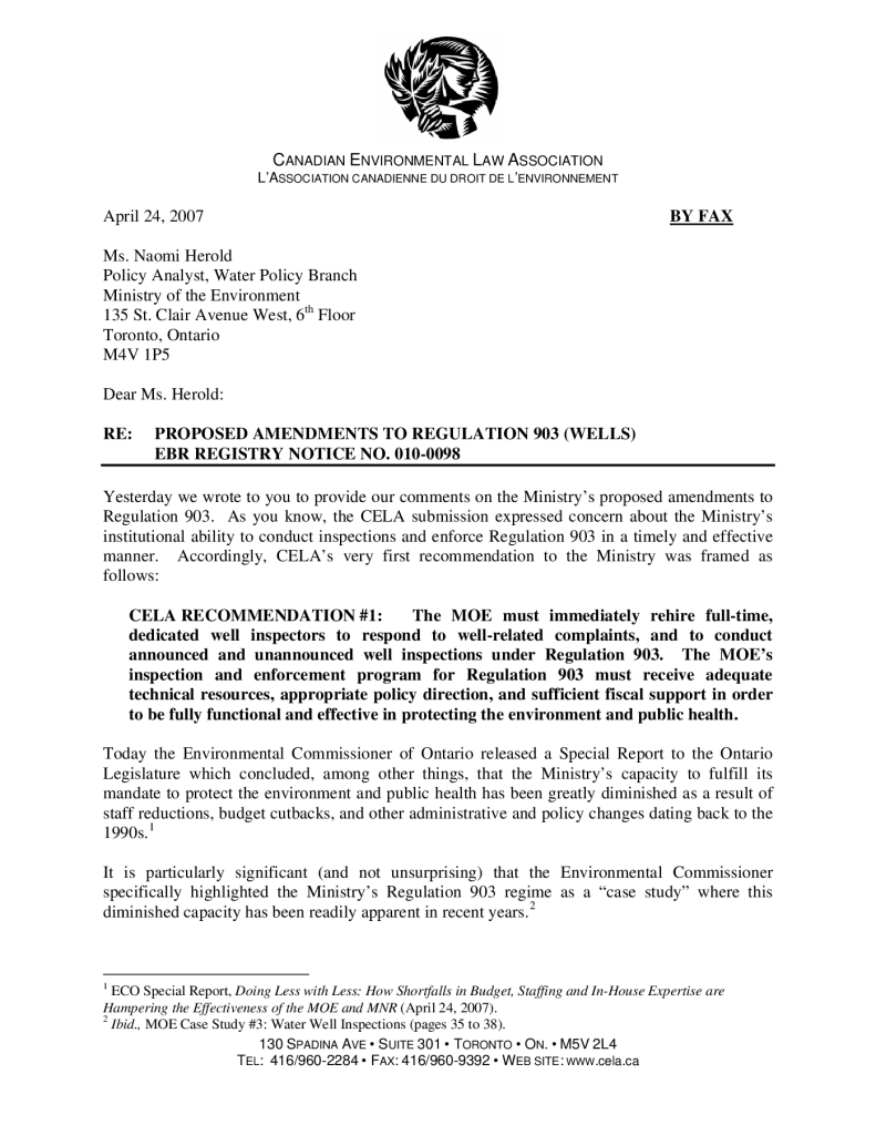 Proposed Amendments to Regulation 903 (Wells) Supplementary to April 23, 2007 submission