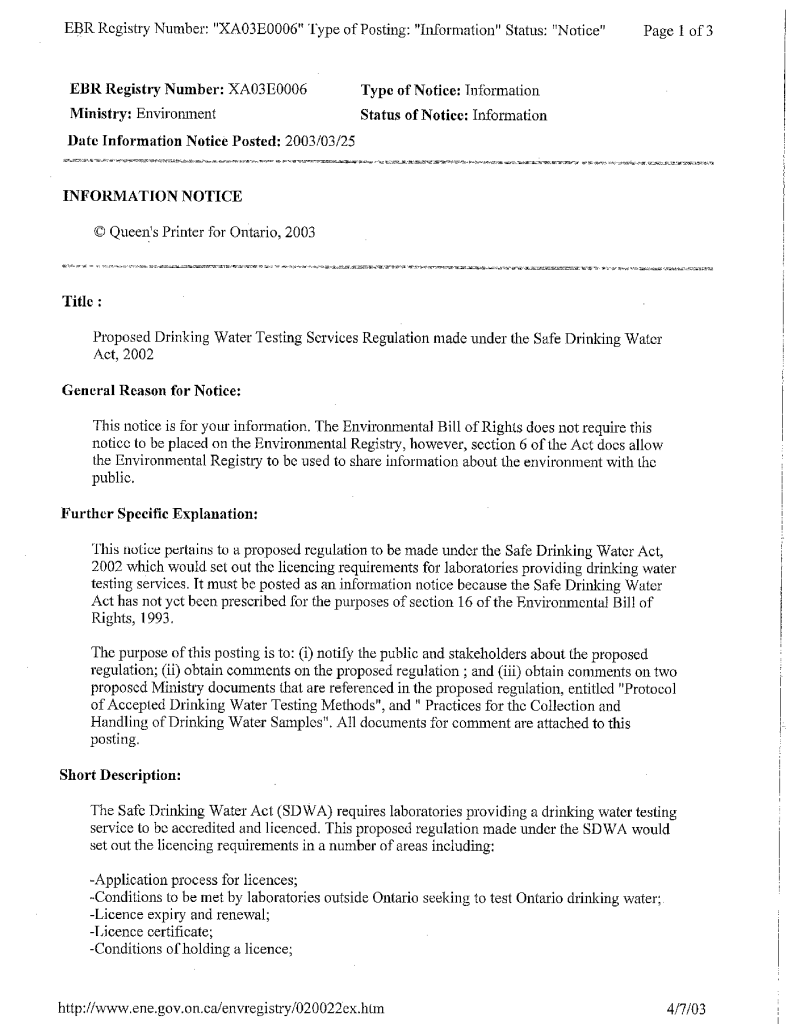 Proposed drinking water testing services regulation made under the safe drinking water ace, 2002