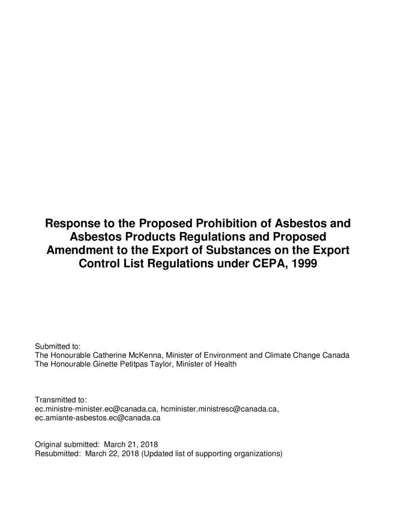 Proposed Prohibition of Asbestos and Asbestos Products Regulations and Proposed Amendment to the Export of Substances on the Export Control List Regulations under CEPA, 1999