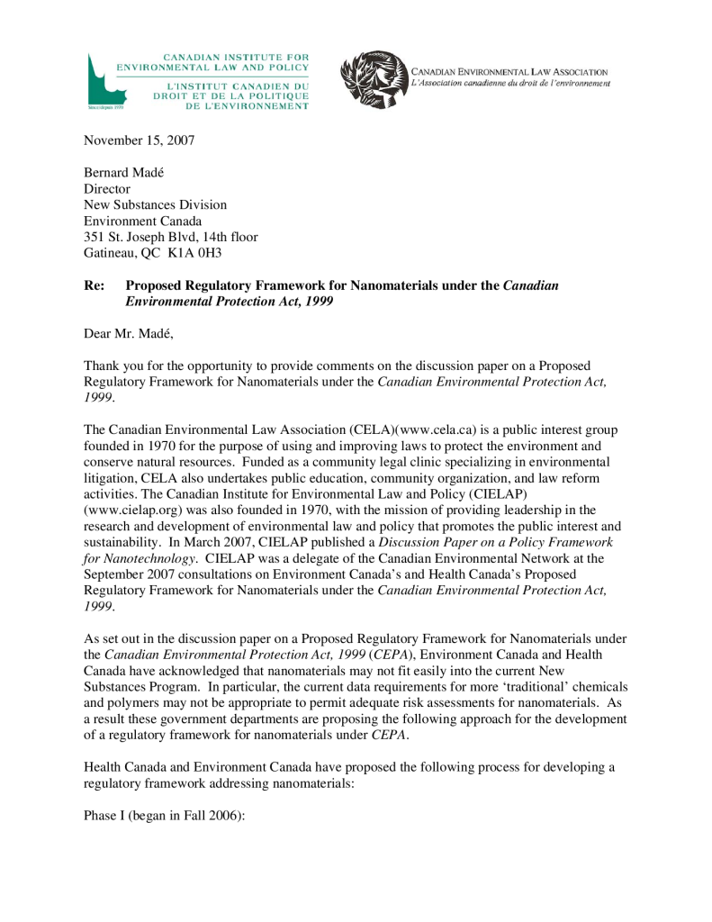 Proposed Regulatory Framework for Nanomaterials under the Canadian Environmental Protection Act, 1999