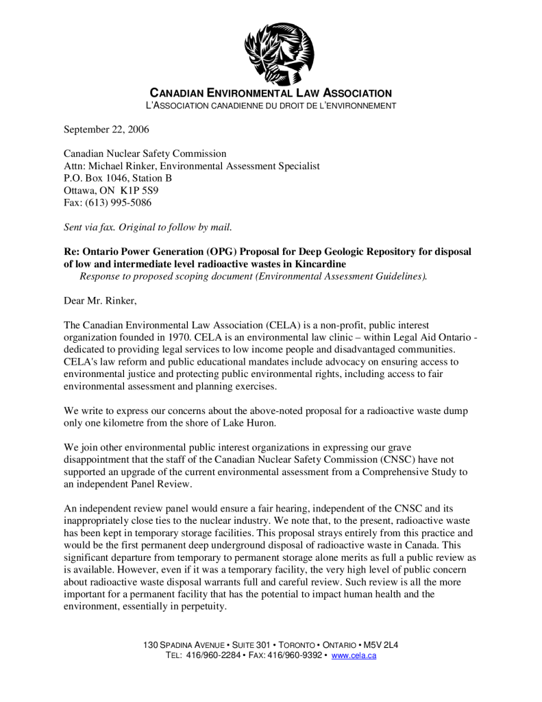 Proposed scoping document for OPG proposal for deep geologic repository for disposal of low and intermediate radioactive wastes in Kincardine