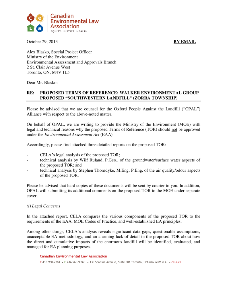 Proposed Terms of Reference: Walker Environmental Group Proposed “Southwestern Landfill” (Zorra Township) Letter to the Ministry of Environment