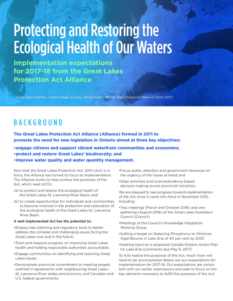 Protecting and Restoring the Ecological Health of Our Waters: Implementation expectations for 2017-18 from the Great Lakes Protection Act Alliance