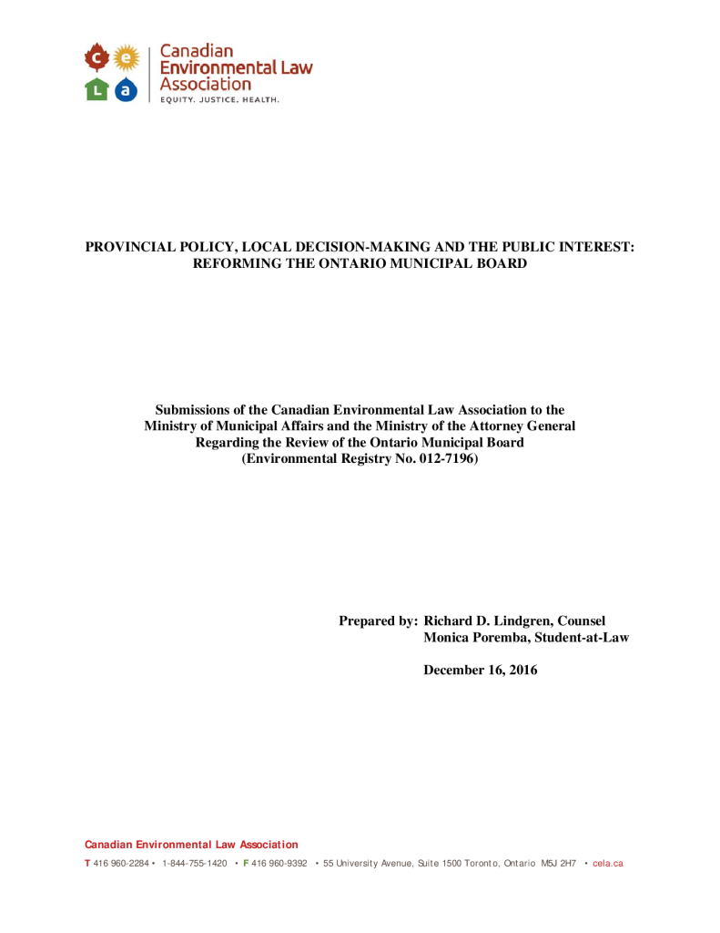 Provincial Policy, Local Decision-Making and the Public Interest: Reforming the Ontario Municipal Board