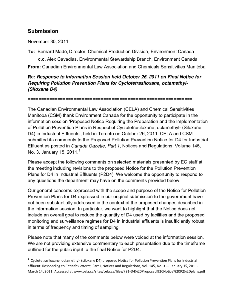 Re Final Notice for Requiring Pollution Prevention Plans for Cyclotetrasiloxane, octamethyl- (Siloxane D4)